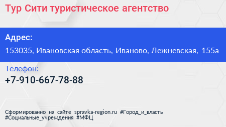 Тур Сити, туристическое агентство по адресу 153035, Ивановская область, Иваново, Лежневская, 155а в дальнейшем Организация, размещена в следующих категориях: