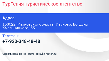 ТурГения, туристическое агентство по адресу 153022, Ивановская область, Иваново, Богдана Хмельницкого, 55 в дальнейшем Организация, размещена в следующих категориях: