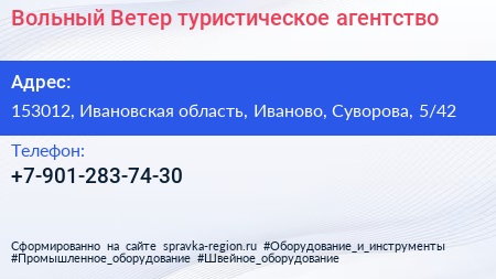 Вольный Ветер, туристическое агентство по адресу 153012, Ивановская область, Иваново, Суворова, 5/42 в дальнейшем Организация, размещена в следующих категориях: