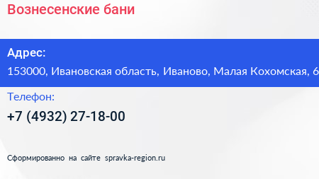Вознесенские бани по адресу 153000, Ивановская область, Иваново, Малая Кохомская, 6 в дальнейшем Организация, размещена в следующих категориях:
