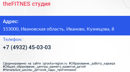 theFITNES, студия по адресу 153000, Ивановская область, Иваново, Кузнецова, 8 в дальнейшем Организация, размещена в следующих категориях: