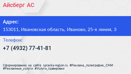 Айсберг АС по адресу 153011, Ивановская область, Иваново, 25-я линия, 3 в дальнейшем Организация, размещена в следующих категориях: