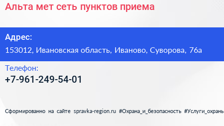 Альта-мет, сеть пунктов приема по адресу 153012, Ивановская область, Иваново, Суворова, 76а в дальнейшем Организация, размещена в следующих категориях: