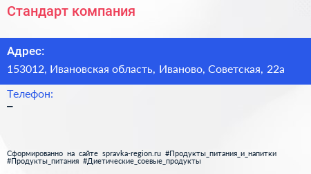 Стандарт, компания по адресу 153012, Ивановская область, Иваново, Советская, 22а в дальнейшем Организация, размещена в следующих категориях: