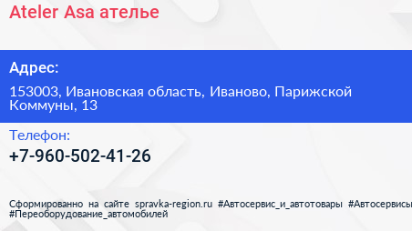 Ateler Asa, ателье по адресу 153003, Ивановская область, Иваново, Парижской Коммуны, 13 в дальнейшем Организация, размещена в следующих категориях: