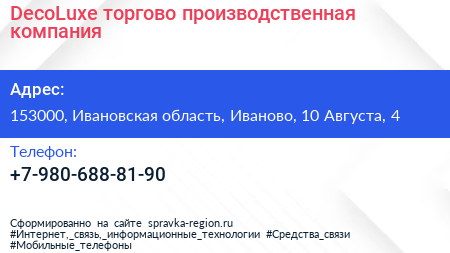 DecoLuxe, торгово-производственная компания по адресу 153000, Ивановская область, Иваново, 10 Августа, 4 в дальнейшем Организация, размещена в следующих категориях: