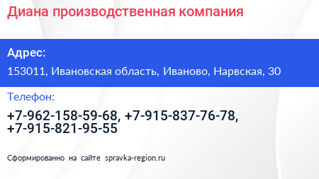 Диана, производственная компания по адресу 153011, Ивановская область, Иваново, Нарвская, 30 в дальнейшем Организация, размещена в следующих категориях: