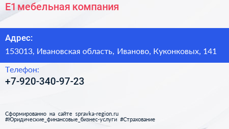 E1, мебельная компания по адресу 153013, Ивановская область, Иваново, Куконковых, 141 в дальнейшем Организация, размещена в следующих категориях: