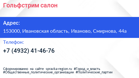 Гольфстрим, салон по адресу 153000, Ивановская область, Иваново, Смирнова, 44а в дальнейшем Организация, размещена в следующих категориях: