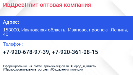 ИвДревПлит, оптовая компания по адресу 153000, Ивановская область, Иваново, проспект Ленина, 40 в дальнейшем Организация, размещена в следующих категориях: