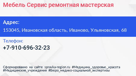 Мебель Сервис, ремонтная мастерская по адресу 153045, Ивановская область, Иваново, Ульяновская, 68 в дальнейшем Организация, размещена в следующих категориях: