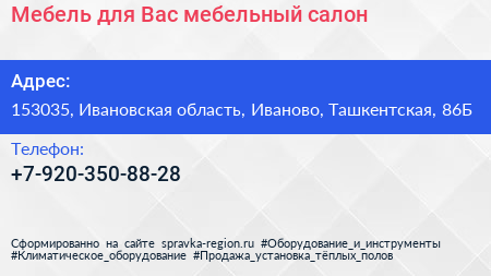 Мебель для Вас, мебельный салон по адресу 153035, Ивановская область, Иваново, Ташкентская, 86Б в дальнейшем Организация, размещена в следующих категориях: