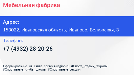Мебельная фабрика по адресу 153022, Ивановская область, Иваново, Велижская, 3 в дальнейшем Организация, размещена в следующих категориях: