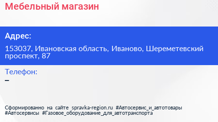 Мебельный магазин по адресу 153037, Ивановская область, Иваново, Шереметевский проспект, 87 в дальнейшем Организация, размещена в следующих категориях: