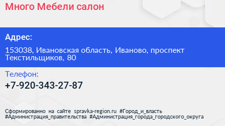 Много Мебели, салон по адресу 153038, Ивановская область, Иваново, проспект Текстильщиков, 80 в дальнейшем Организация, размещена в следующих категориях: