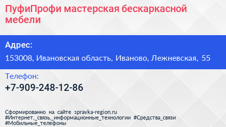 ПуфиПрофи, мастерская бескаркасной мебели по адресу 153008, Ивановская область, Иваново, Лежневская, 55 в дальнейшем Организация, размещена в следующих категориях: