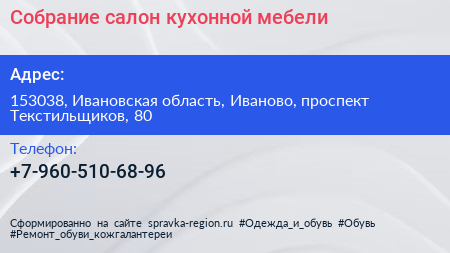 Собрание, салон кухонной мебели по адресу 153038, Ивановская область, Иваново, проспект Текстильщиков, 80 в дальнейшем Организация, размещена в следующих категориях: