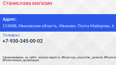 Станислава, магазин по адресу 153008, Ивановская область, Иваново, Поэта Майорова, 6 в дальнейшем Организация, размещена в следующих категориях: