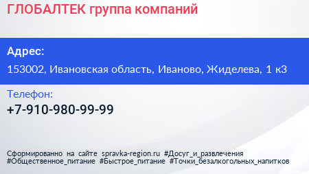 ГЛОБАЛТЕК, группа компаний по адресу 153002, Ивановская область, Иваново, Жиделева, 1 к3 в дальнейшем Организация, размещена в следующих категориях: