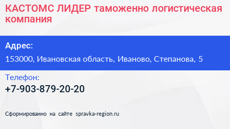 КАСТОМС ЛИДЕР, таможенно-логистическая компания по адресу 153000, Ивановская область, Иваново, Степанова, 5 в дальнейшем Организация, размещена в следующих категориях: