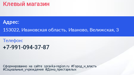 Клевый, магазин по адресу 153022, Ивановская область, Иваново, Велижская, 3 в дальнейшем Организация, размещена в следующих категориях: