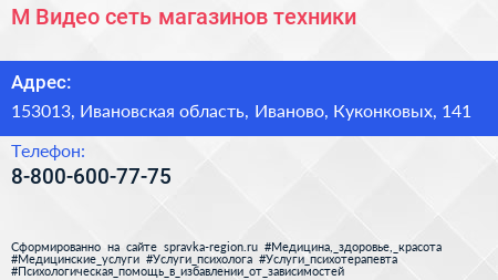 М.Видео, сеть магазинов техники по адресу 153013, Ивановская область, Иваново, Куконковых, 141 в дальнейшем Организация, размещена в следующих категориях: