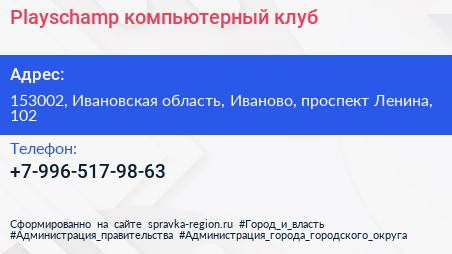 Playschamp, компьютерный клуб по адресу 153002, Ивановская область, Иваново, проспект Ленина, 102 в дальнейшем Организация, размещена в следующих категориях: