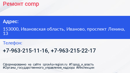 Ремонт comp по адресу 153000, Ивановская область, Иваново, проспект Ленина, 13 в дальнейшем Организация, размещена в следующих категориях: