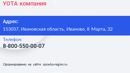 YOTA, компания по адресу 153037, Ивановская область, Иваново, 8 Марта, 32 в дальнейшем Организация, размещена в следующих категориях: