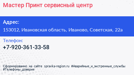 Мастер Принт, сервисный центр по адресу 153012, Ивановская область, Иваново, Советская, 22а в дальнейшем Организация, размещена в следующих категориях: