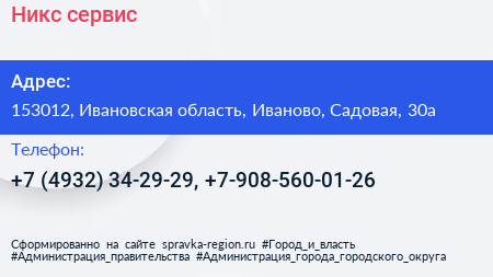Никс сервис по адресу 153012, Ивановская область, Иваново, Садовая, 30а в дальнейшем Организация, размещена в следующих категориях: