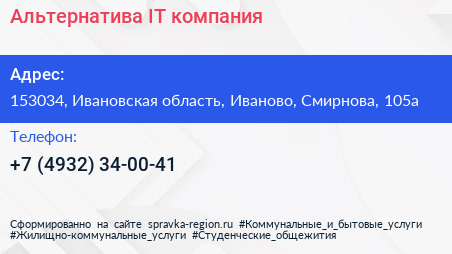 Альтернатива, IT-компания по адресу 153034, Ивановская область, Иваново, Смирнова, 105а в дальнейшем Организация, размещена в следующих категориях: