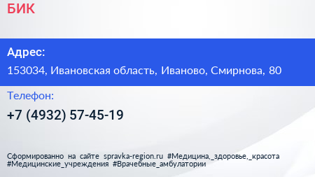 БИК по адресу 153034, Ивановская область, Иваново, Смирнова, 80 в дальнейшем Организация, размещена в следующих категориях: