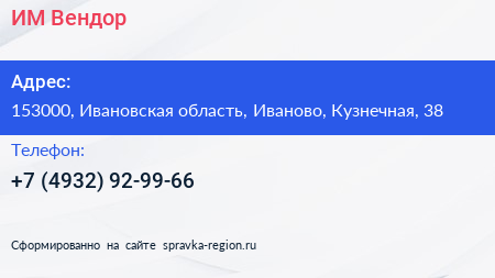 ИМ Вендор по адресу 153000, Ивановская область, Иваново, Кузнечная, 38 в дальнейшем Организация, размещена в следующих категориях:
