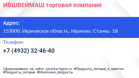 ИВШВЕЙМАШ, торговая компания по адресу 153000, Ивановская область, Иваново, Станко, 18 в дальнейшем Организация, размещена в следующих категориях: