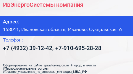 ИвЭнергоСистемы, компания по адресу 153011, Ивановская область, Иваново, Суздальская, 6 в дальнейшем Организация, размещена в следующих категориях: