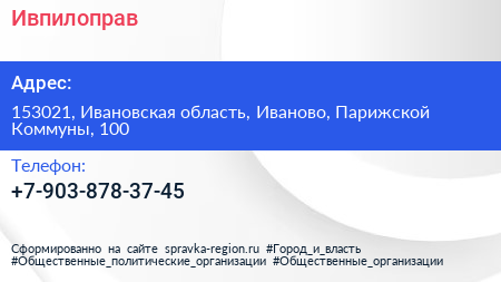 Ивпилоправ по адресу 153021, Ивановская область, Иваново, Парижской Коммуны, 100 в дальнейшем Организация, размещена в следующих категориях:
