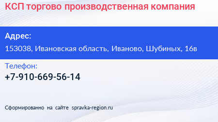 КСП, торгово-производственная компания по адресу 153038, Ивановская область, Иваново, Шубиных, 16в в дальнейшем Организация, размещена в следующих категориях: