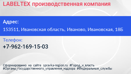 LABELTEX, производственная компания по адресу 153511, Ивановская область, Иваново, Ивановская, 18Б в дальнейшем Организация, размещена в следующих категориях: