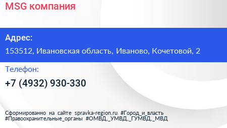 MSG, компания по адресу 153512, Ивановская область, Иваново, Кочетовой, 2 в дальнейшем Организация, размещена в следующих категориях: