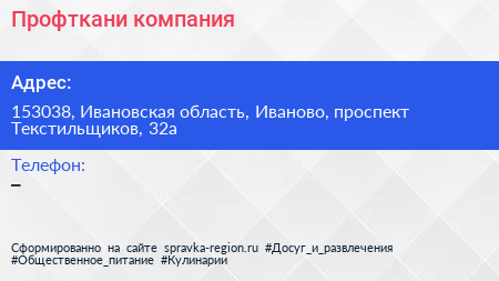 Профткани, компания по адресу 153038, Ивановская область, Иваново, проспект Текстильщиков, 32а в дальнейшем Организация, размещена в следующих категориях:
