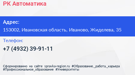 РК Автоматика по адресу 153002, Ивановская область, Иваново, Жиделева, 35 в дальнейшем Организация, размещена в следующих категориях: