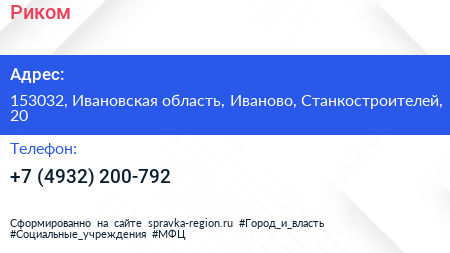 Риком по адресу 153032, Ивановская область, Иваново, Станкостроителей, 20 в дальнейшем Организация, размещена в следующих категориях: