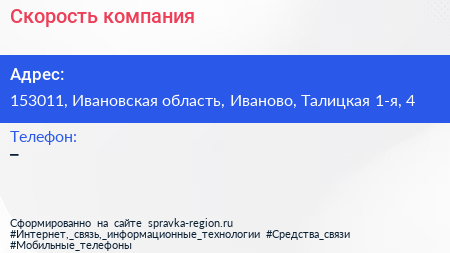 Скорость, компания по адресу 153011, Ивановская область, Иваново, Талицкая 1-я, 4 в дальнейшем Организация, размещена в следующих категориях: