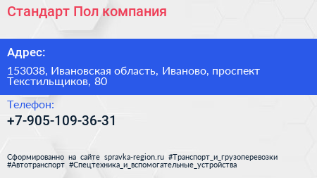 Стандарт Пол, компания по адресу 153038, Ивановская область, Иваново, проспект Текстильщиков, 80 в дальнейшем Организация, размещена в следующих категориях: