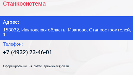 Станкосистема по адресу 153032, Ивановская область, Иваново, Станкостроителей, 1 в дальнейшем Организация, размещена в следующих категориях: