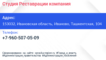Студия Реставрации, компания по адресу 153032, Ивановская область, Иваново, Ташкентская, 104 в дальнейшем Организация, размещена в следующих категориях: