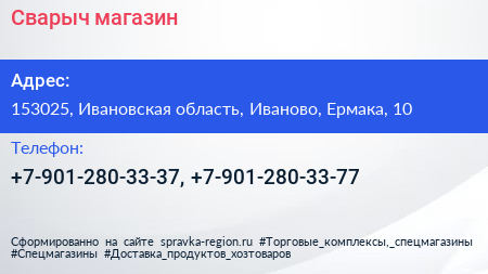 Сварыч, магазин по адресу 153025, Ивановская область, Иваново, Ермака, 10 в дальнейшем Организация, размещена в следующих категориях: