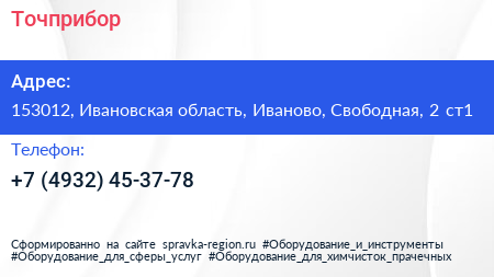 Точприбор по адресу 153012, Ивановская область, Иваново, Свободная, 2 ст1 в дальнейшем Организация, размещена в следующих категориях: