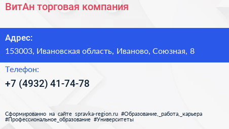 ВитАн, торговая компания по адресу 153003, Ивановская область, Иваново, Союзная, 8 в дальнейшем Организация, размещена в следующих категориях: